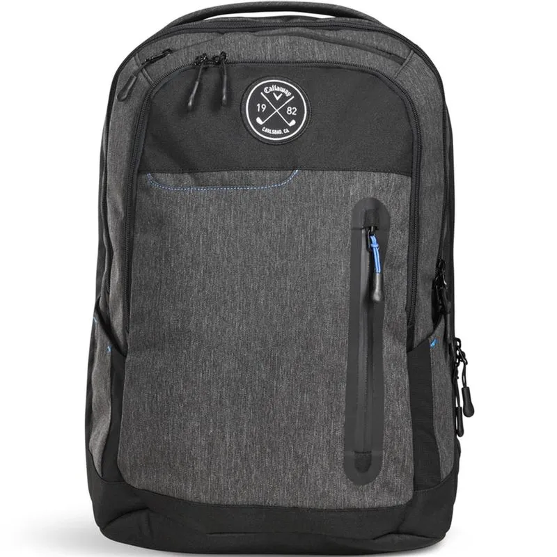 Showcasing durable heather grey fabric, Velour lined Zippered valuables pocket, Quick Access Cell Phone Pocket and built-in organizer and a telescoping handle pass through, the Callaway Clubhouse Backpack is ideal for work or play.