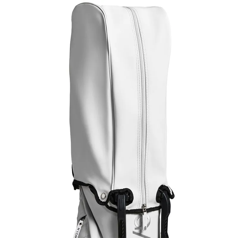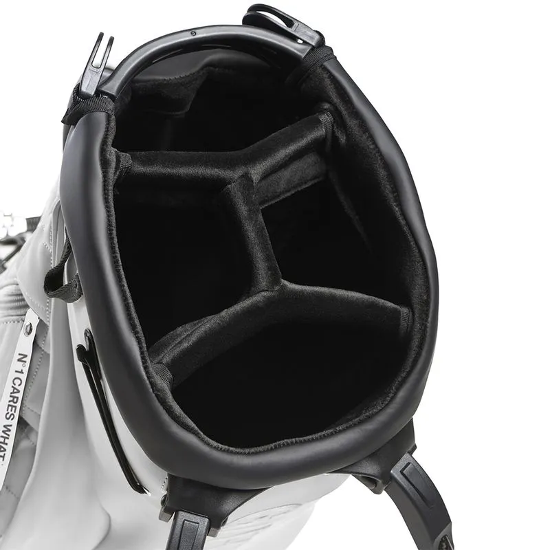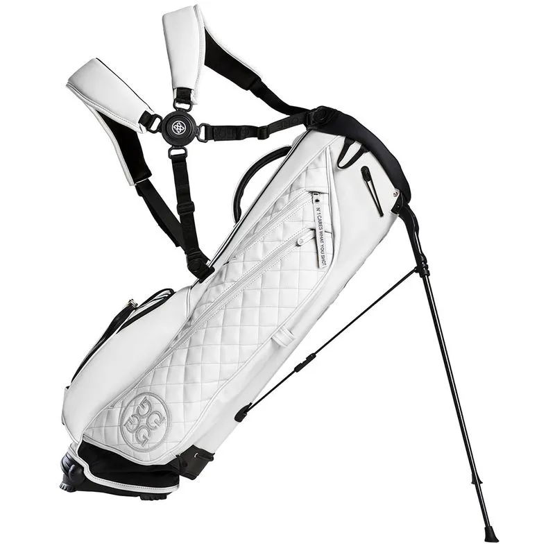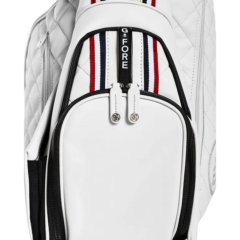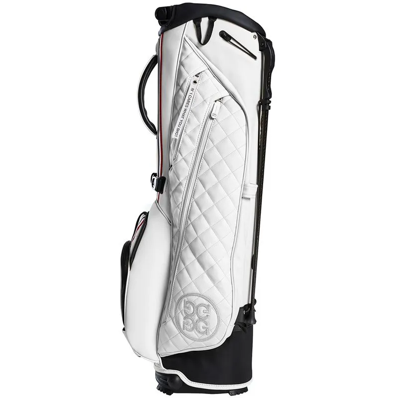 The G/FORE Daytona Plus stand bag '22 boasts sophisticated grosgrain detailing and quilted panels, a self-colored rain hood, and an umbrella holder, as well as several pockets including a large garment compartment, water resistant pocket for personal items, cooler-lined water bottle sleeve, magnetic velour-lined rangefinder pocket, and pen pocket. Shop G/FORE and more at Worldwide Golf Shops.