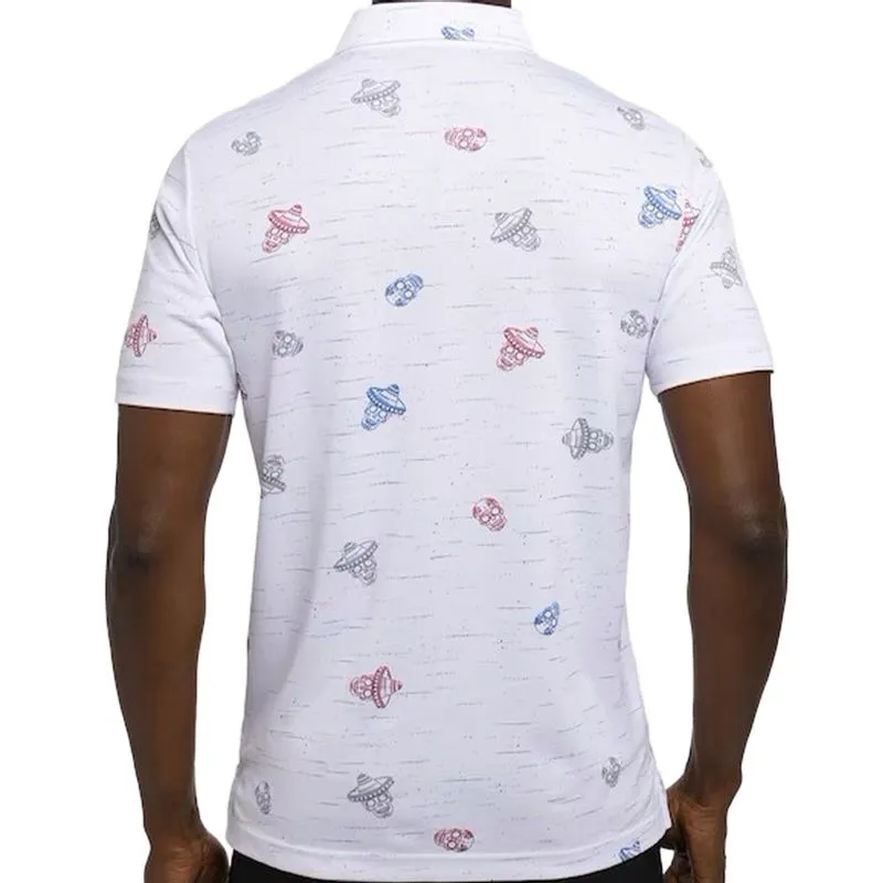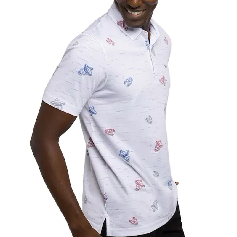 The TravisMathew Men's Mexicali Polo is made with a fun, all-over print, featuring sombrero-wearing party skulls on a printed nep textured background. Shop TravisMathew and more at Worldwide Golf Shops!